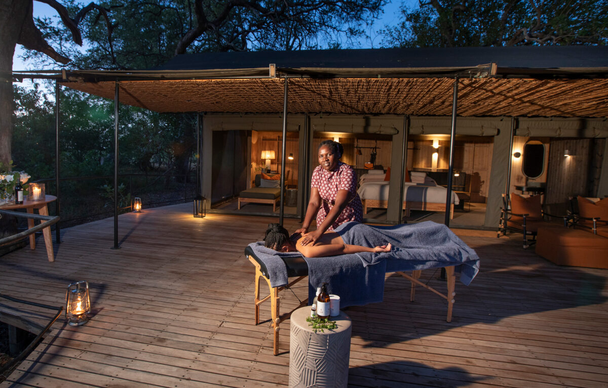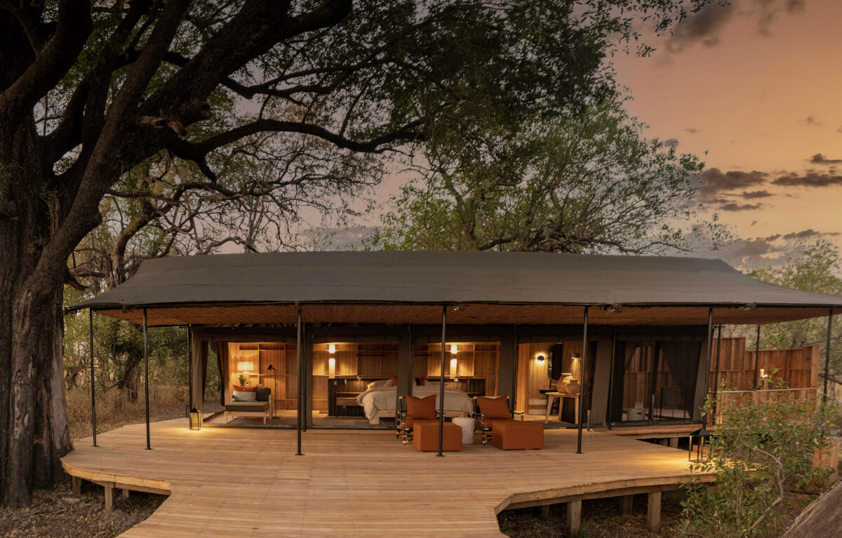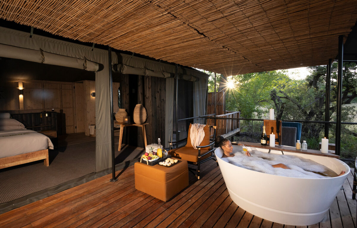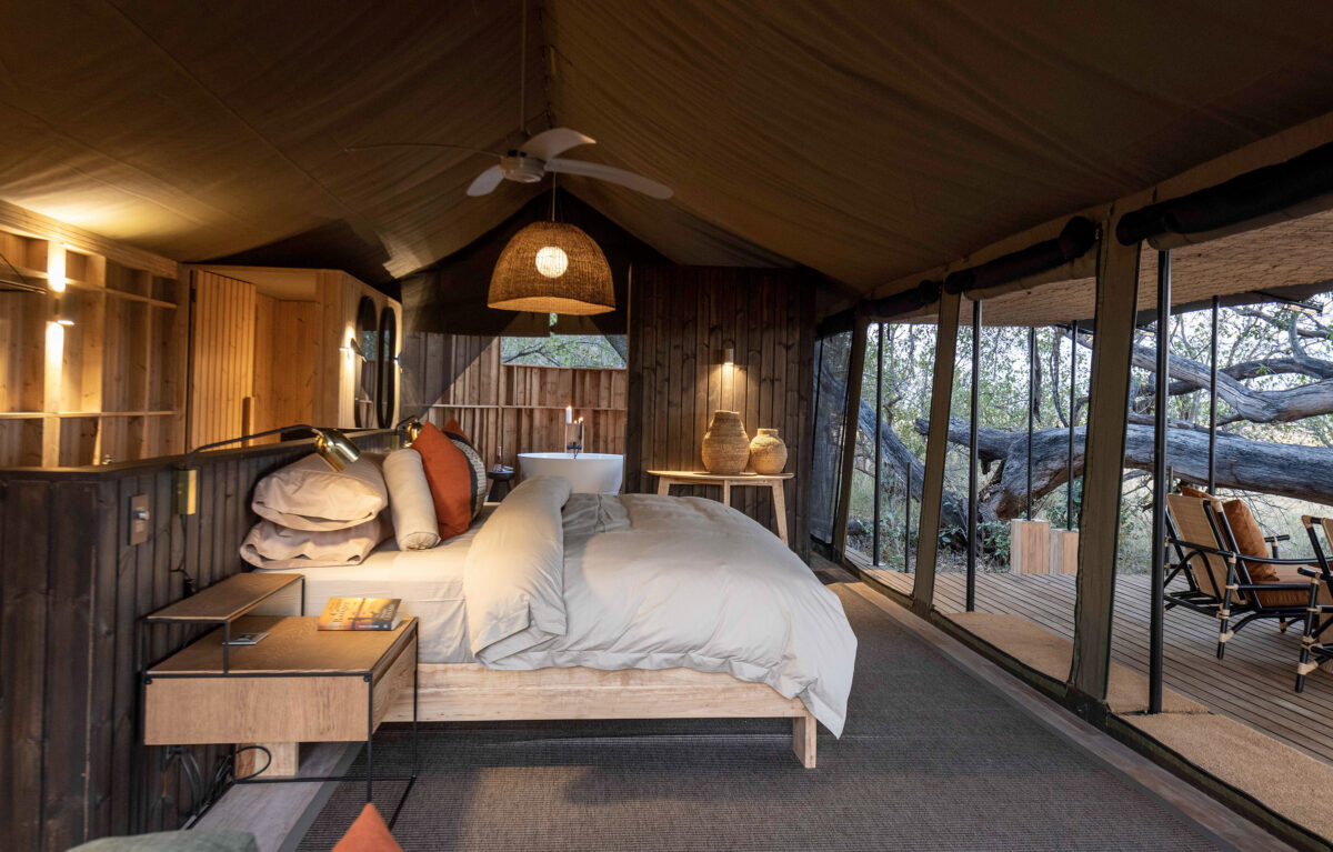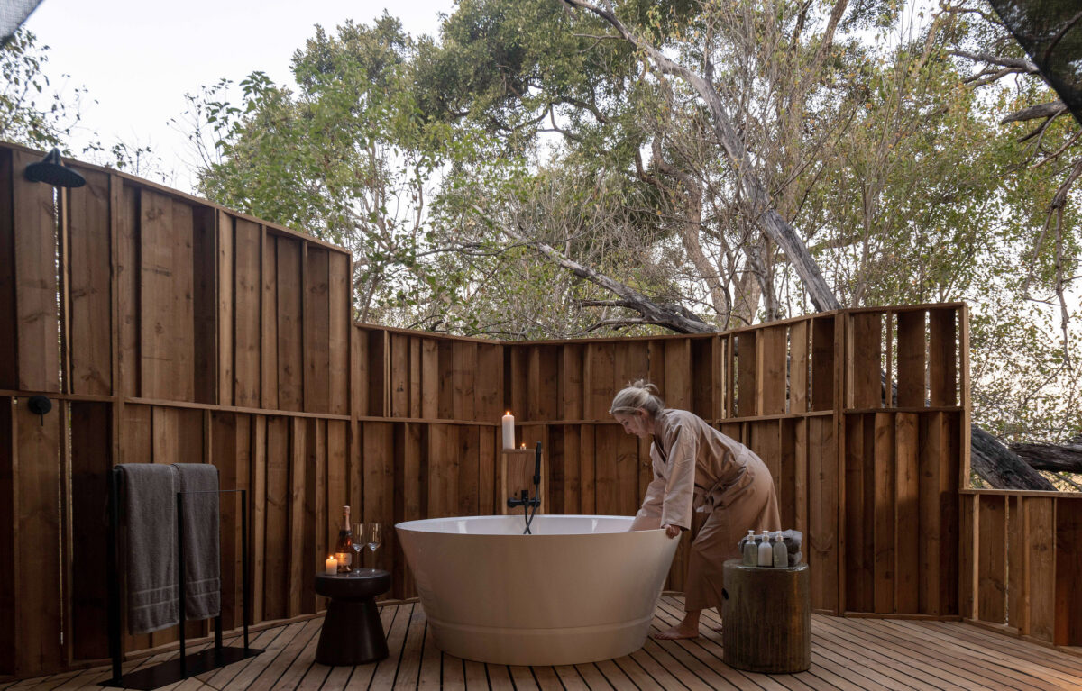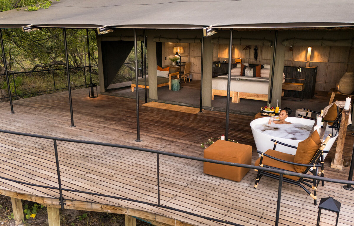 Ten tents – eight doubles and two family suites – accommodate just 24 guests in this deeply reposeful setting. Built on raised wooden decks, the elegant tents are rendered in the classic safari palette: ebony-toned woods, woven reeds, and billowing canvas. A generous king bed is just the start, as each cossetting suite comes with, in effect, not one but two bathrooms – witness the private deck, fitted with an en plein air bath and shower. Kiri’s much-lauded cuisine is enjoyed in stylish indoor and outdoor dining areas, all fine places to convene after the sybaritic pleasures of the pool, an in-suite massage, or simply time well spent in a shaded reading nook with an infinity view. Modern comforts are thoughtfully pared back – expect solar energy and clever cooling fans in lieu of air-conditioning.