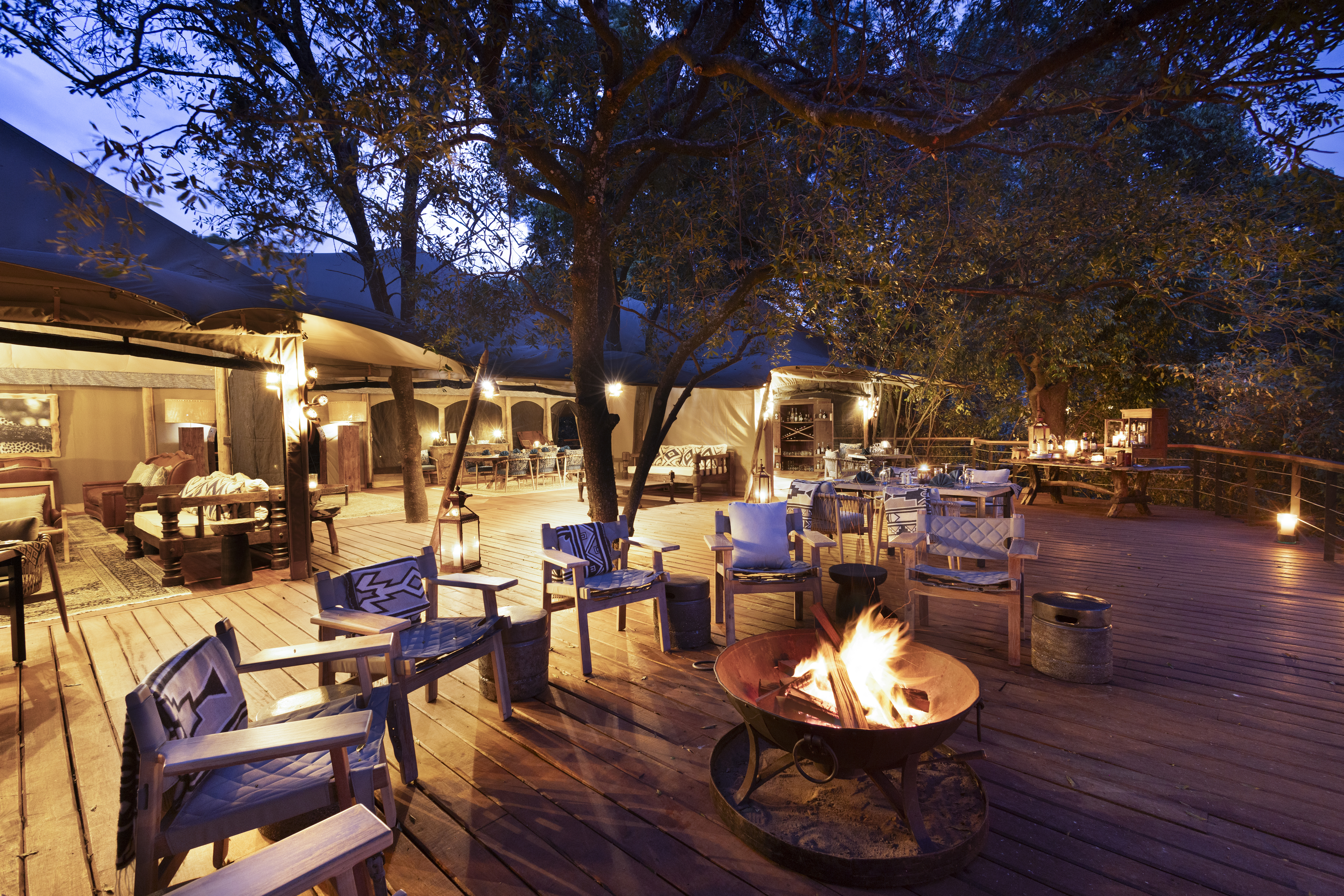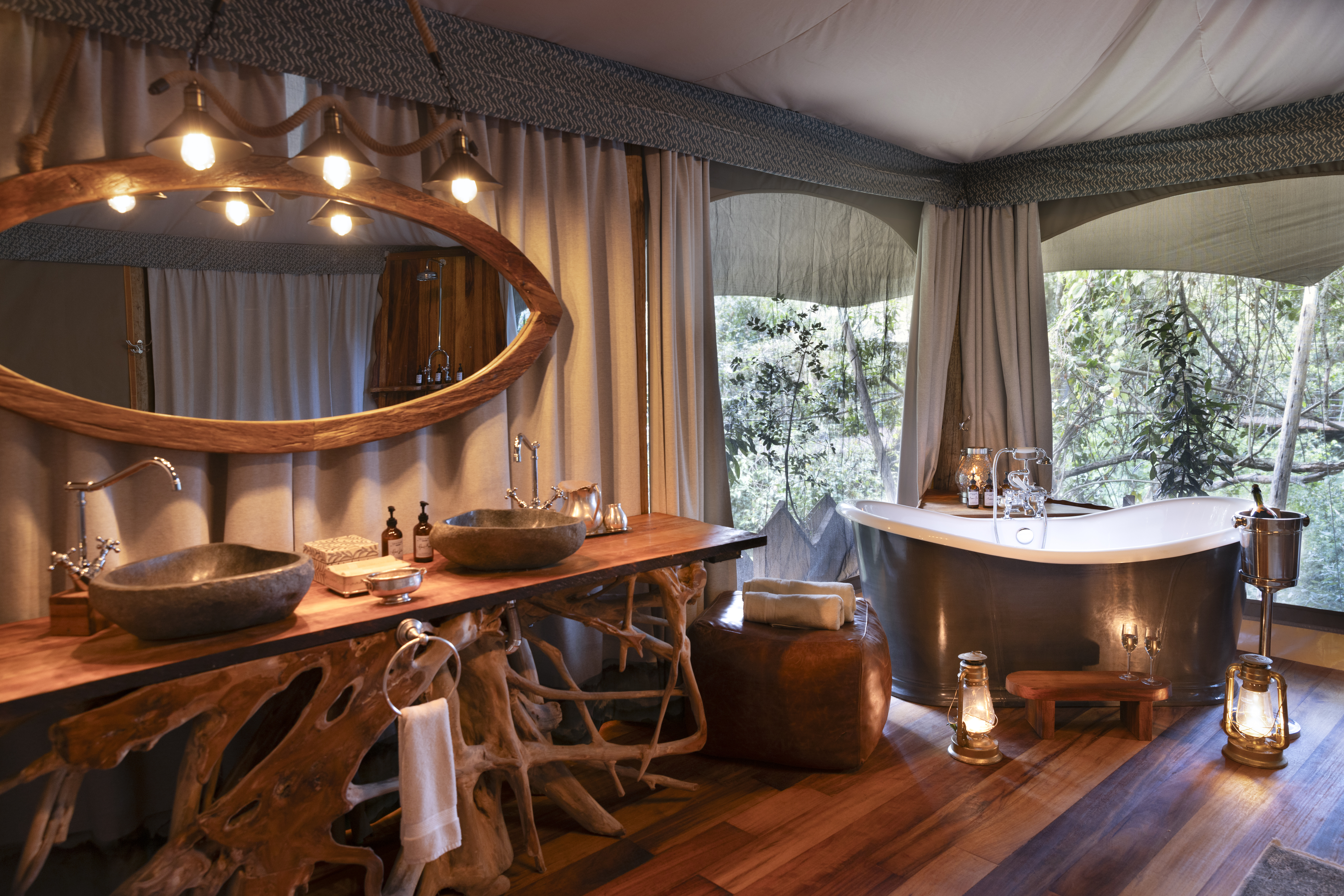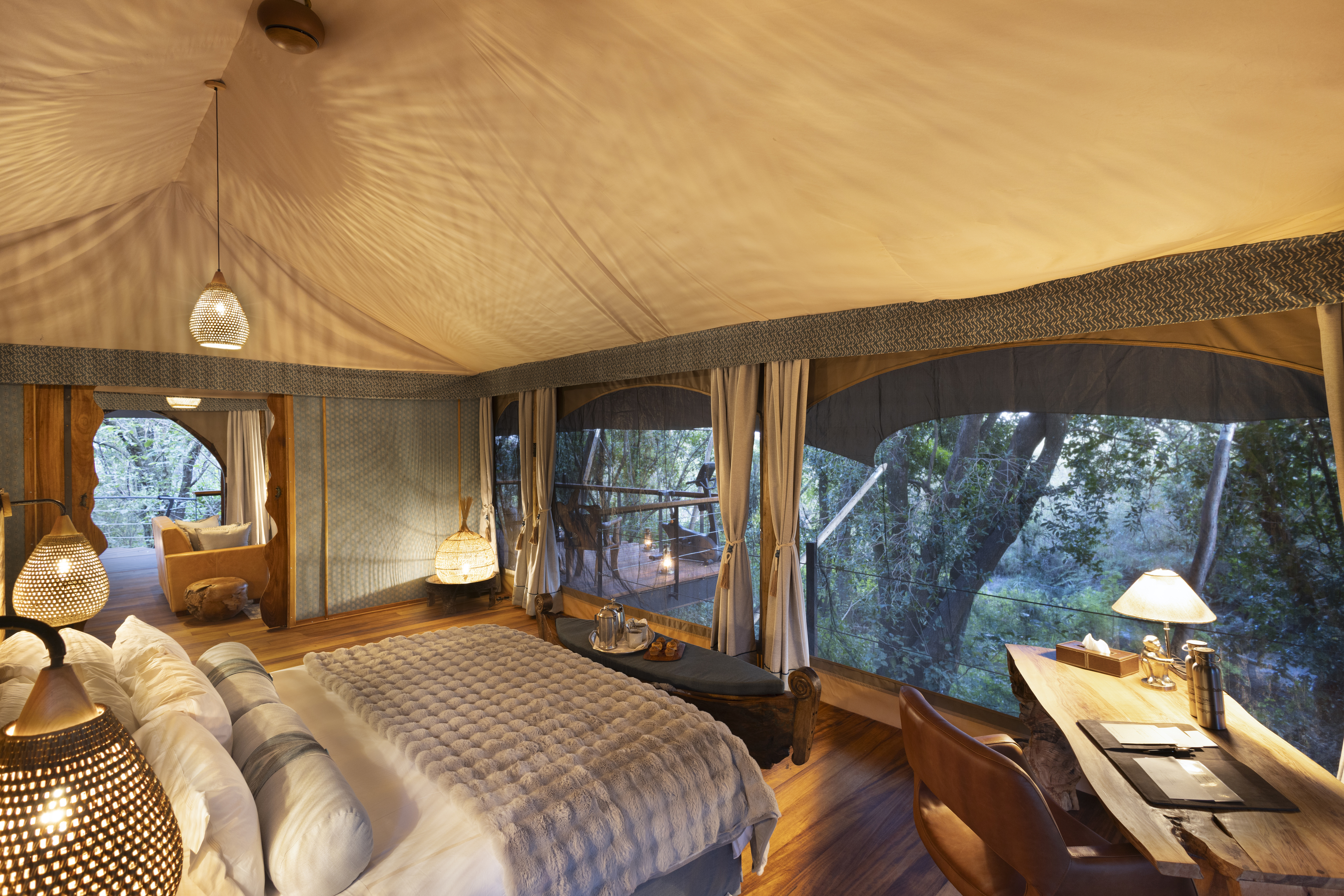 “Toto” means “baby” in Swahili—and that name gives a playful nod to this Great Plains Conservation camp’s intimate size. It comprises just four treetop tented suites, each a spacious aerie with smooth wooden floors, skilfully carved, leaf-shaped benches, memory-foam, king-sized beds, and baths with granite double vanity sinks and deep copper tubs. Screened canvas walls open onto the sound of branches rustling in the breeze, and birdsong and hippos splashing below. Your private veranda has both a lounge area and, should you be fitness-inclined, a stationary bike, yoga mat, and light weights. The suites connect to a communal gathering space, where leather sofas, a book-filled library, and a wide outdoor dining deck with a fire pit invite lingering over meals, drinks, and stories of the day’s adventures.