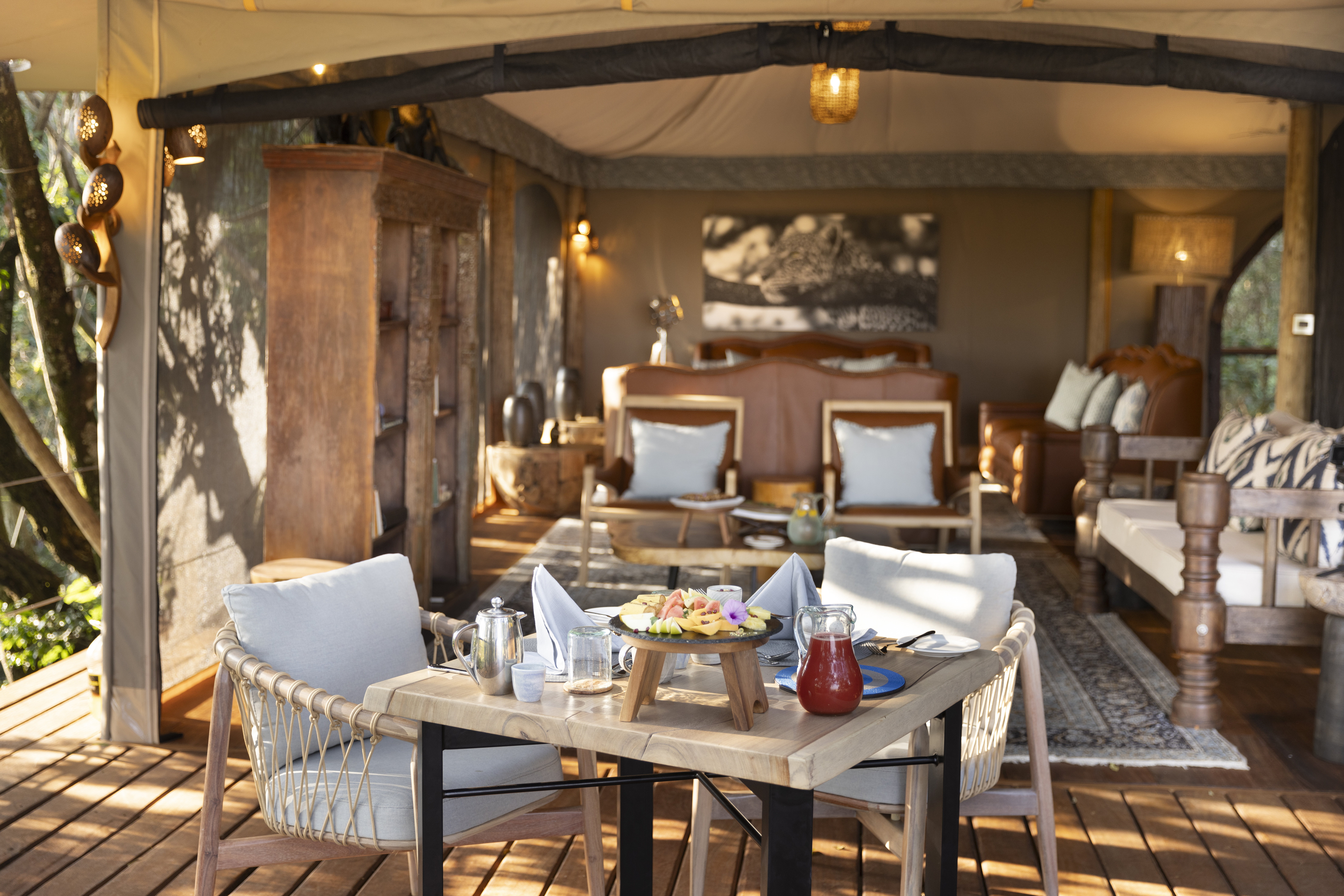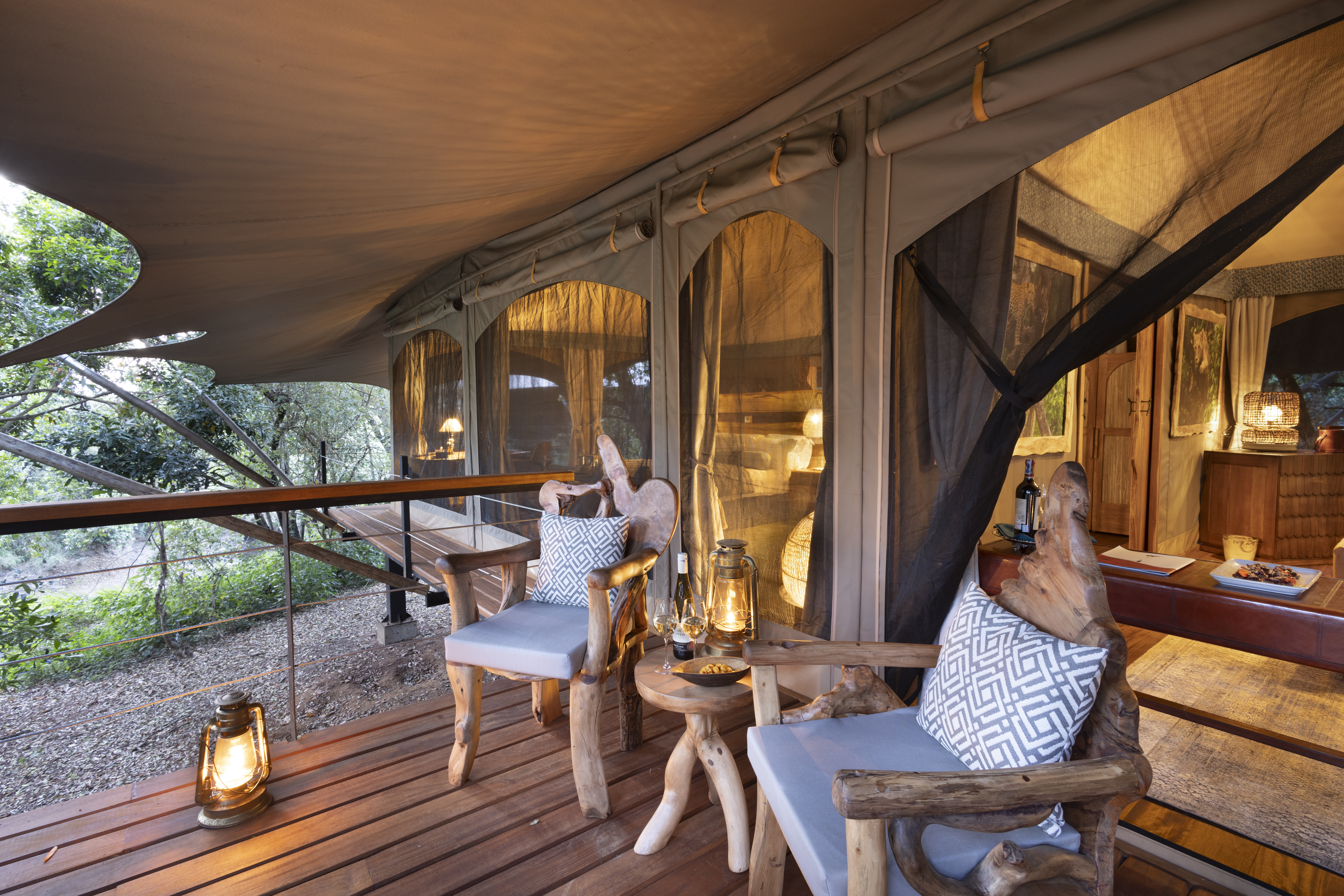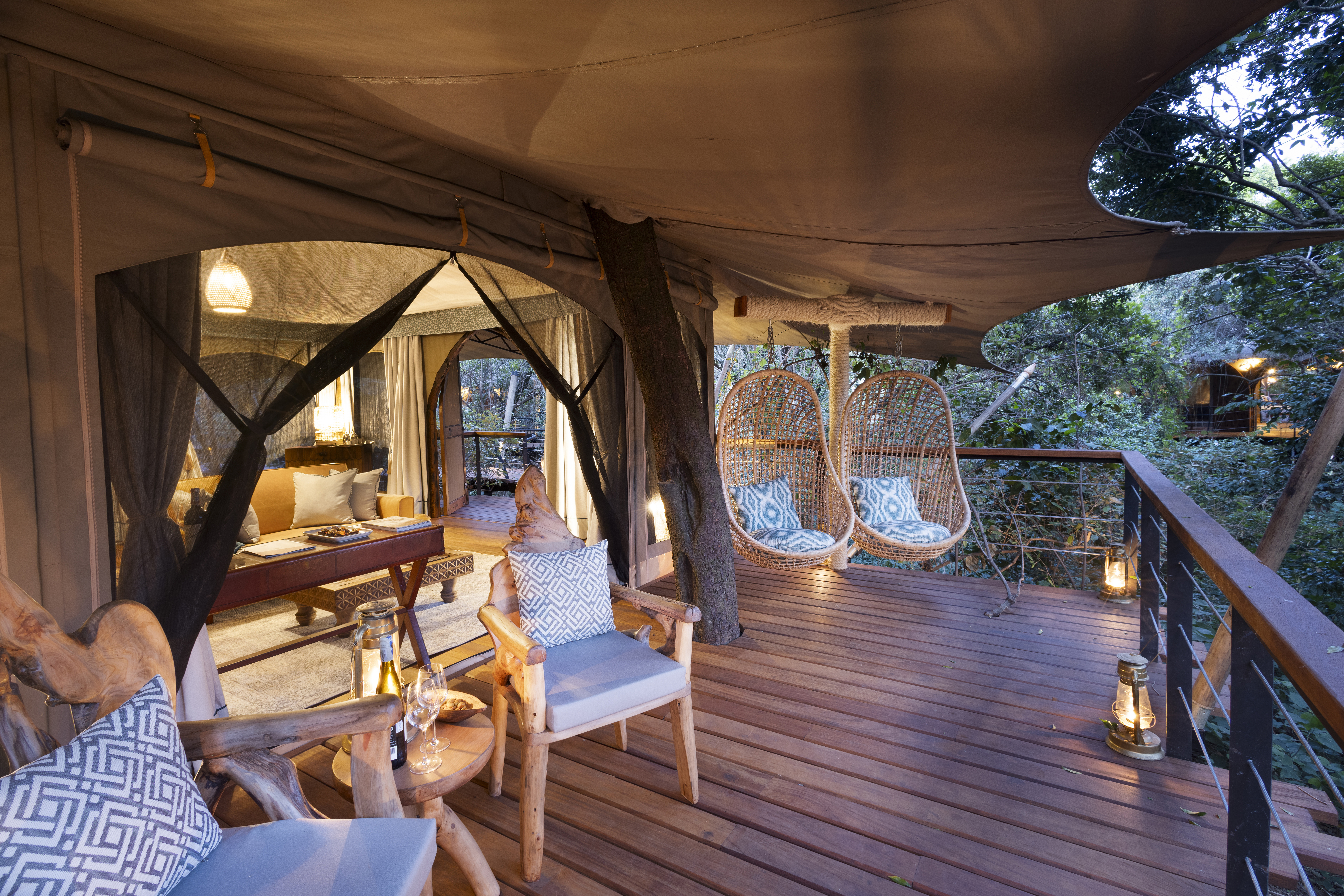 “Toto” means “baby” in Swahili—and that name gives a playful nod to this Great Plains Conservation camp’s intimate size. It comprises just four treetop tented suites, each a spacious aerie with smooth wooden floors, skilfully carved, leaf-shaped benches, memory-foam, king-sized beds, and baths with granite double vanity sinks and deep copper tubs. Screened canvas walls open onto the sound of branches rustling in the breeze, and birdsong and hippos splashing below. Your private veranda has both a lounge area and, should you be fitness-inclined, a stationary bike, yoga mat, and light weights. The suites connect to a communal gathering space, where leather sofas, a book-filled library, and a wide outdoor dining deck with a fire pit invite lingering over meals, drinks, and stories of the day’s adventures.
