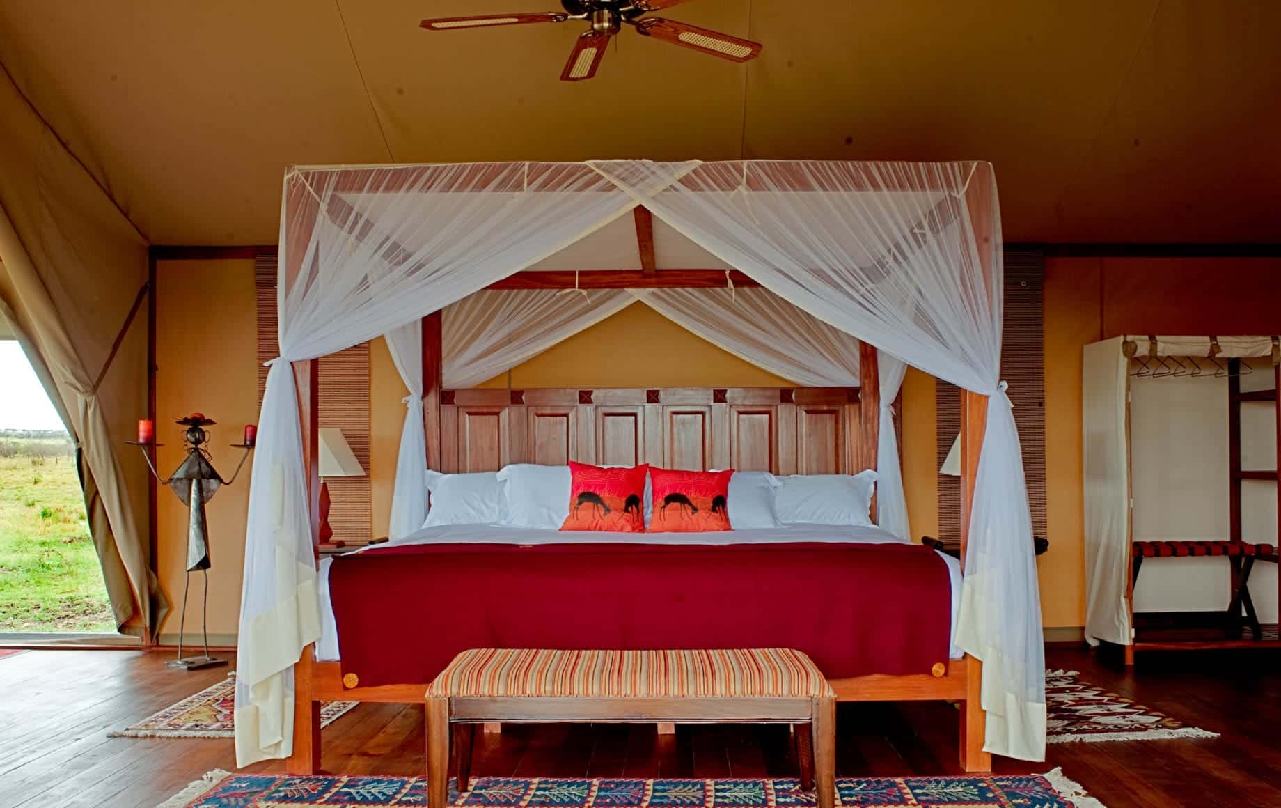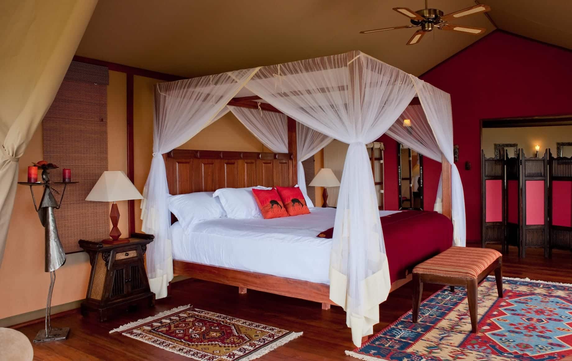 Olare Mara’s spacious tents, perched on handsome mvuli wood decks, feature lovely extra-roomy canopied beds, separate bed and living rooms, a classic safari writing desk, modern bath and powder rooms, and a terrace from which to catch the Mara’s endless cavalcade of animals. (And of course, they are tents in about the same way that the Hope Diamond is a bauble.)