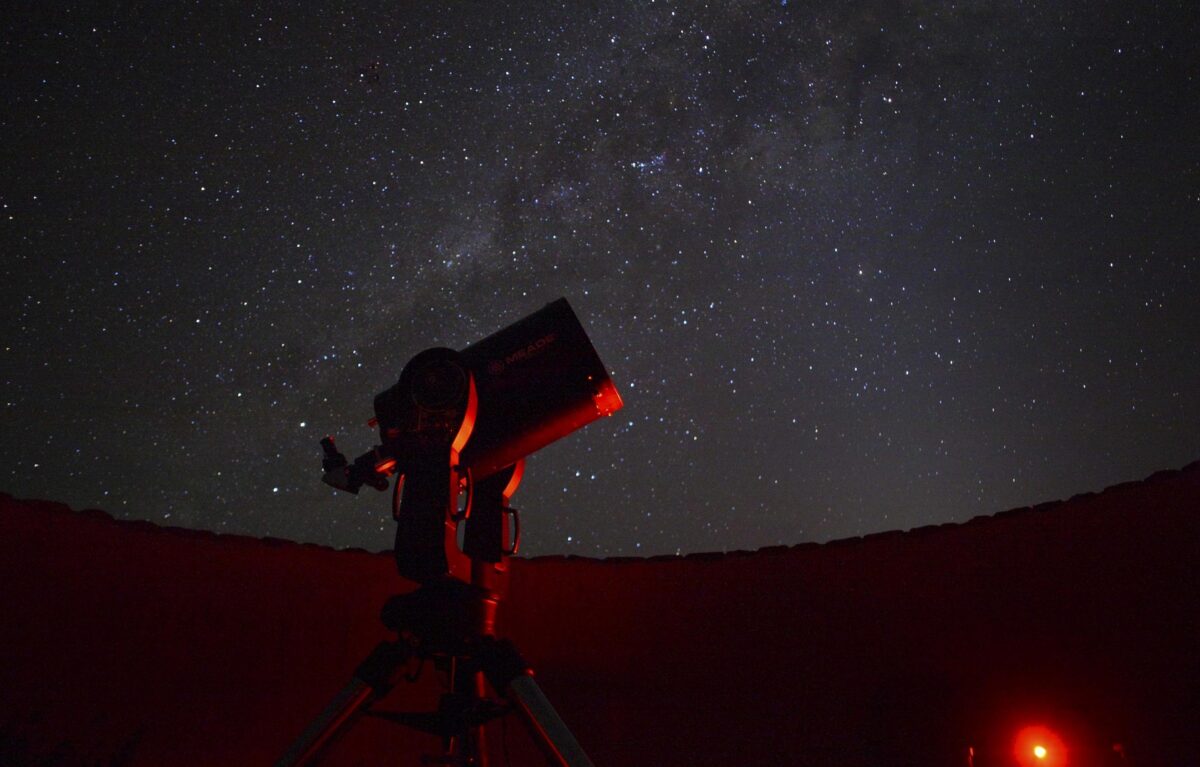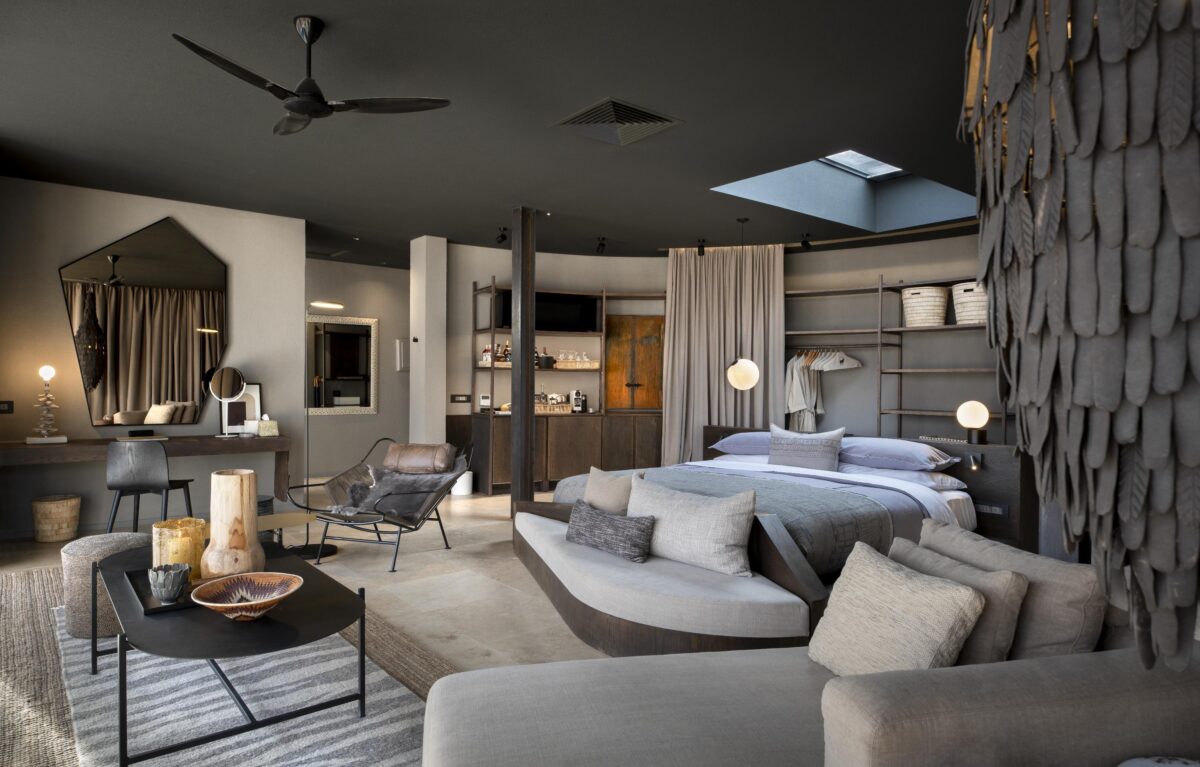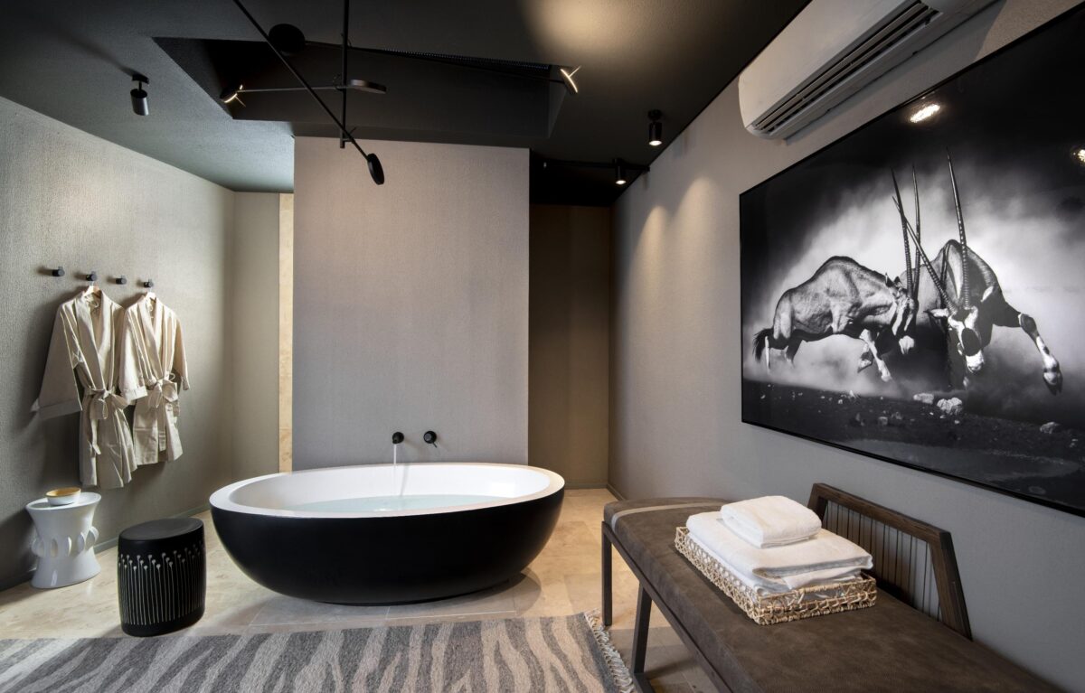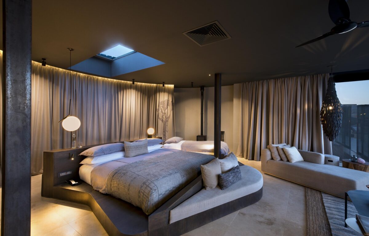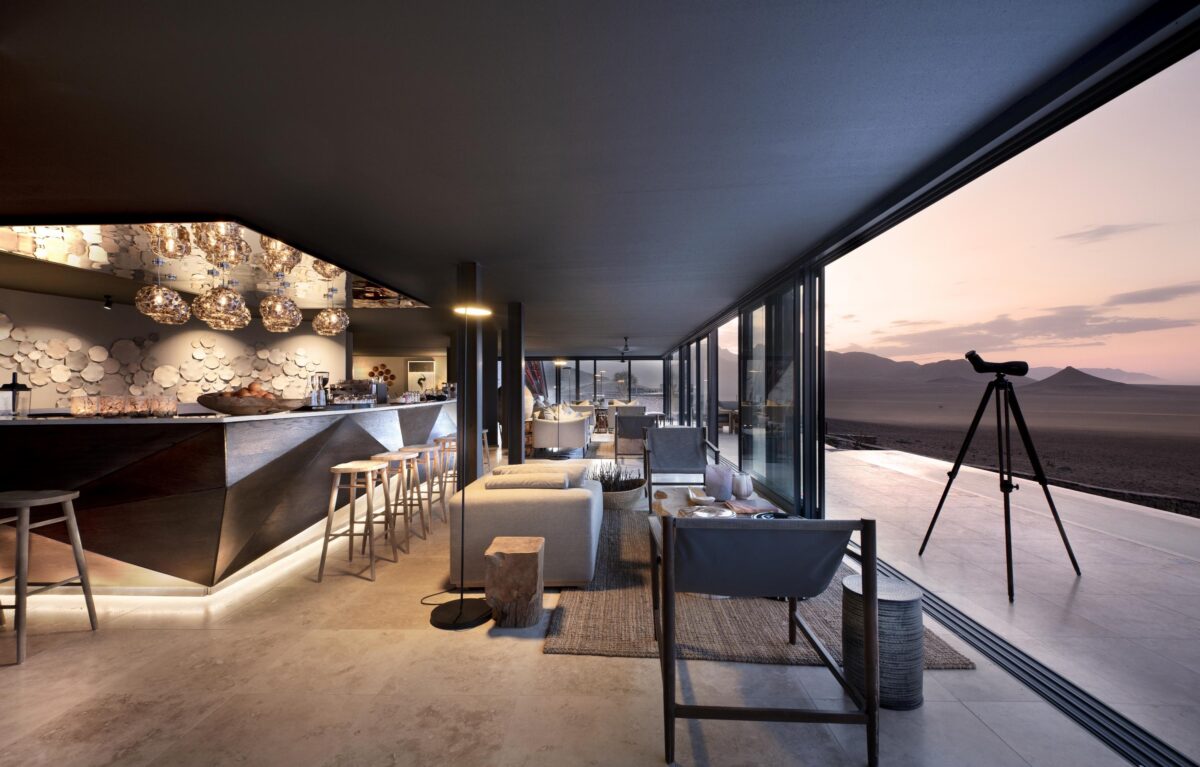 The lodge’s shared lounge and dining area are built around a central bar, where delightfully deep couches look out onto a watering hole through floor-to-ceiling glass windows. Upstairs, wellness facilities are available for massages and hydrating shea butter treatments, and there’s a gym also. Take dinner in the outdoor boma, watching the campfire flickering in the night, or head to the observatory, where a resident astronomer will guide us through Namibia’s most storied constellations.