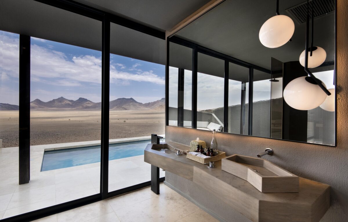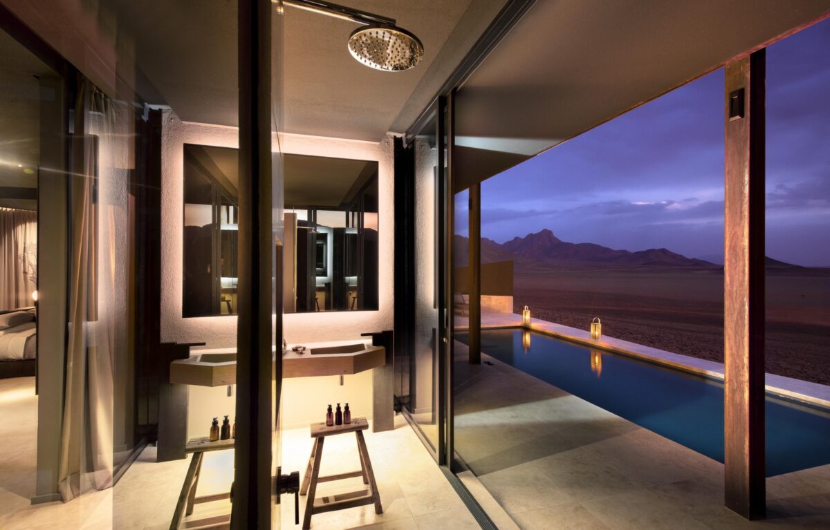 &Beyond Sossusvlei Desert Lodge consists of 10 Suites and one Star Dune Suite, lined along an escarpment to ensure far-ranging views and, at the same time, an unshakeable sense of peaceful solitude. Bearing rounded walls and natural-hued furnishings, each suite’s minimal yet ergonomic layout feels reminiscent of the landscapes beyond. Inside, our glass-fronted bedroom awaits with a king-size bed under a retractable skylight, in addition to a fireplace for chilly evenings and an en-suite bathroom with a double vanity and glass-encased rain shower, which proffers 180º views of the desert. Outside, we’ll find a private veranda dining area, a plunge pool, and an outdoor shower. The Star Dune Suite is much the same, with two bedrooms linked by a covered walkway in addition to a private lounge and dining room.
