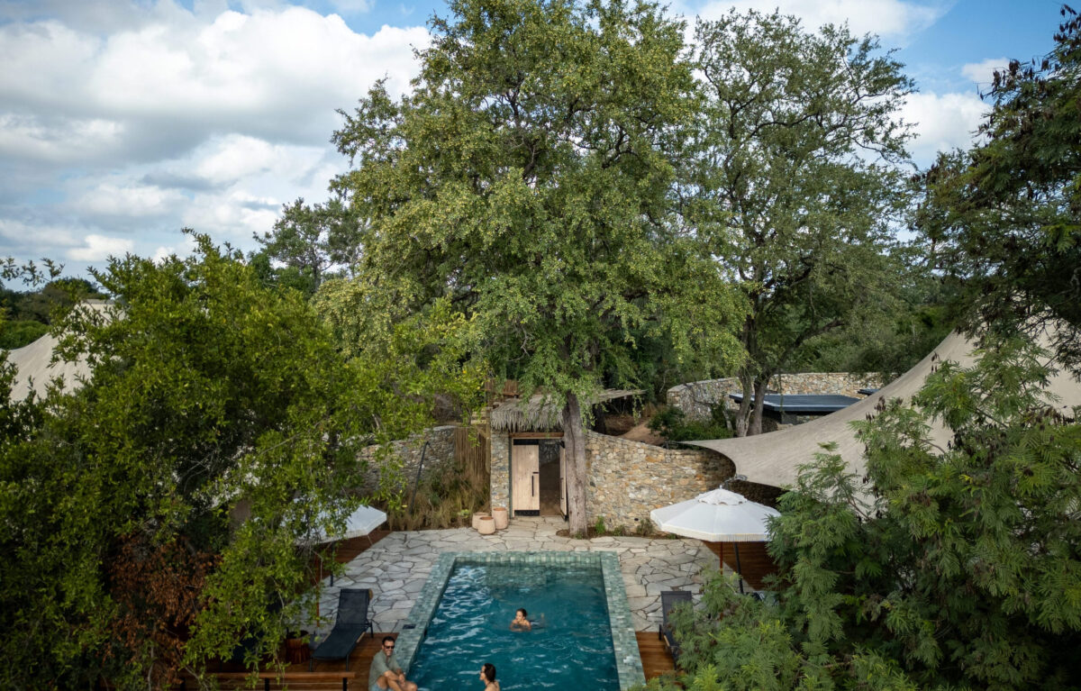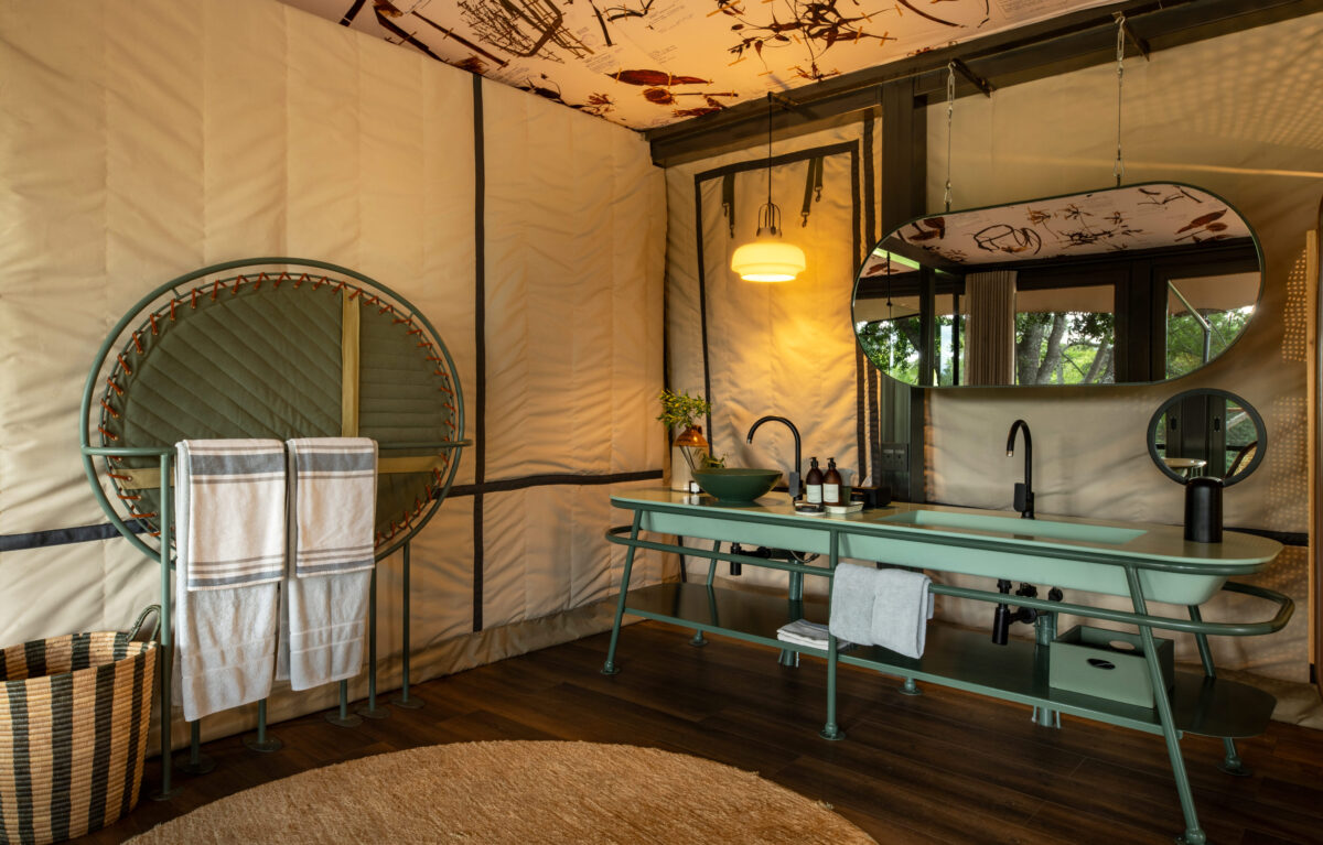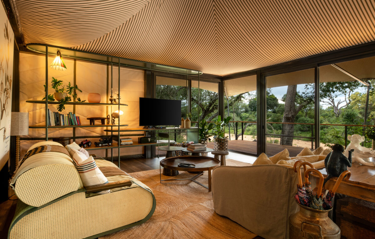 This exclusive-use tented villa, ideally suited for two adults and small children, with flexibility to host four additional guests in neighbouring tent, is nestled within the private confines of Thornybush Nature Reserve, adjacent to Kruger National Park. The inspiration behind the interior design, the meticulous imaginings of celebrated architects Silvio Rech and Lesley Carstens, stems from the adventurous spirit of South Africa’s 19th-century Gold Rush—playfully paired with 21st-century refinement.