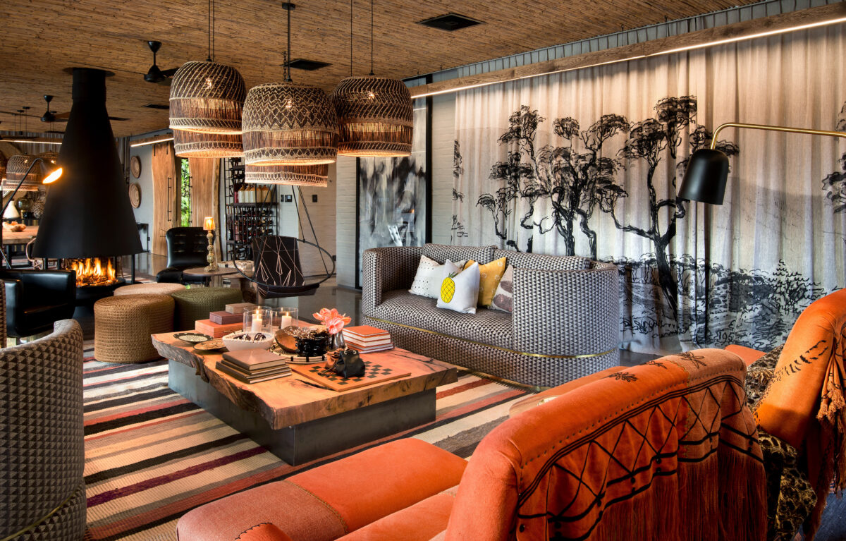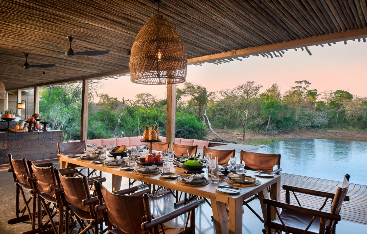 The elegant Phinda Homestead feels like a home in the African bush. Two suites, catty-corner to a specially furnished, double bunk-bed children’s suite, faces an enclosed courtyard, across from a private gym and library. Continuing on to the rest of this farmhouse space, we’ll come upon a covered veranda, sun deck, and spacious rim-flow swimming pool, as well as the lounge and the dining room. In the adjacent interactive kitchen, guests can unwind each evening and watch as meals are prepared—a private, cheerful chef’s table meal.